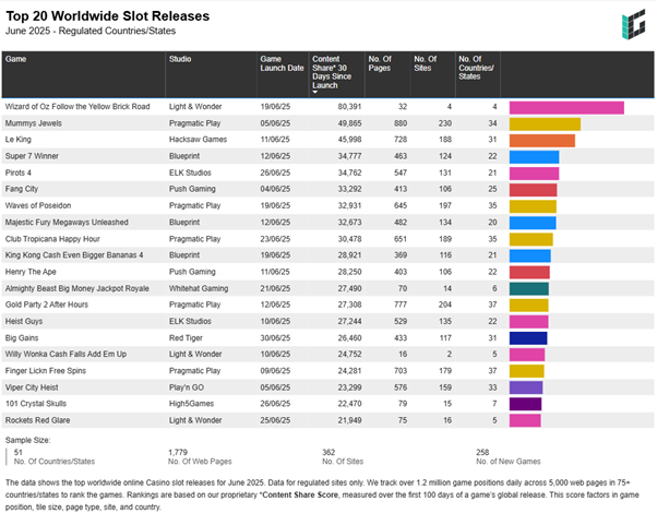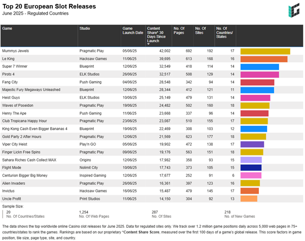 The table shows the top 20 game releases for June on regulated Casino sites, based on our proprietary Content Share Score.